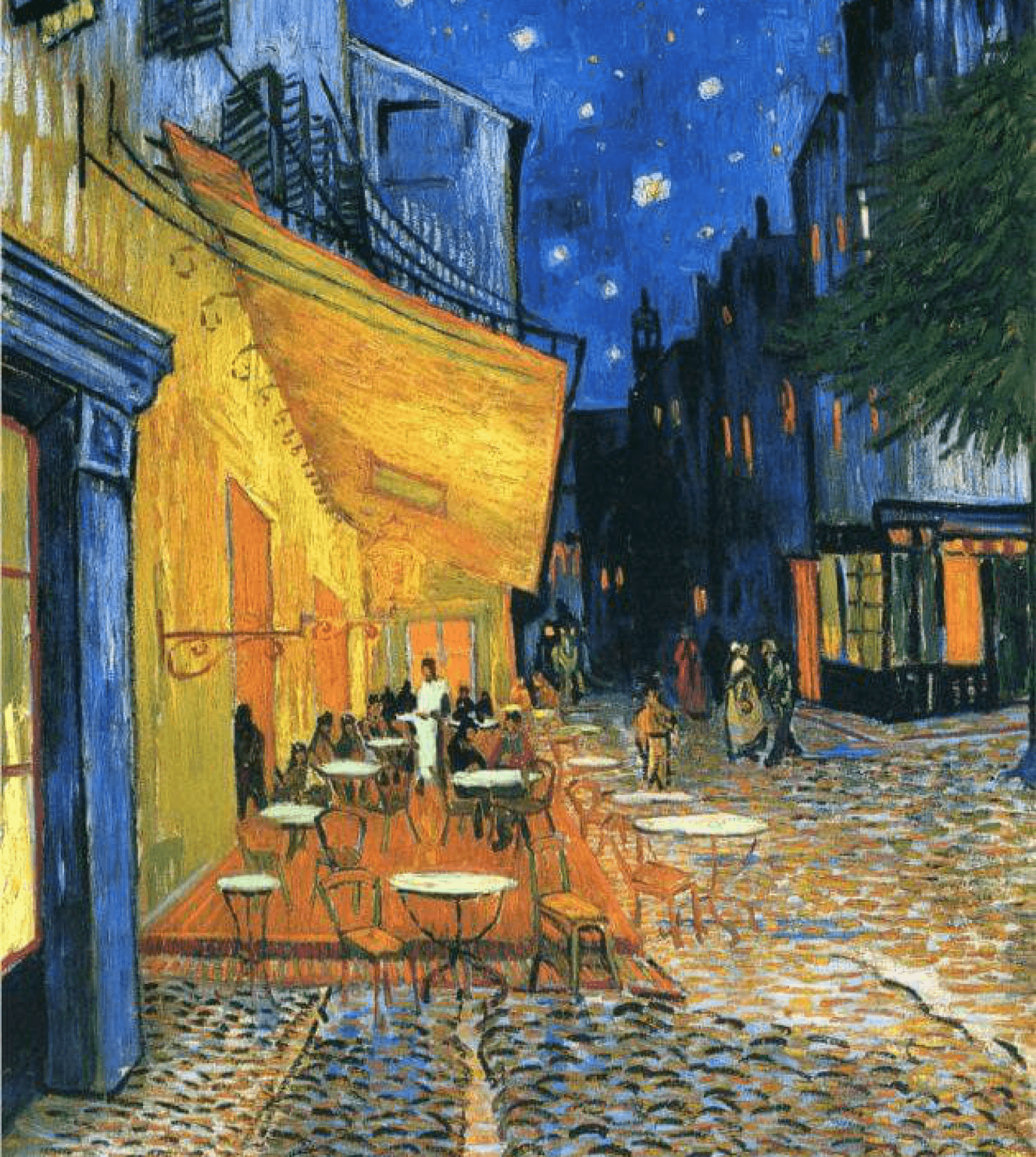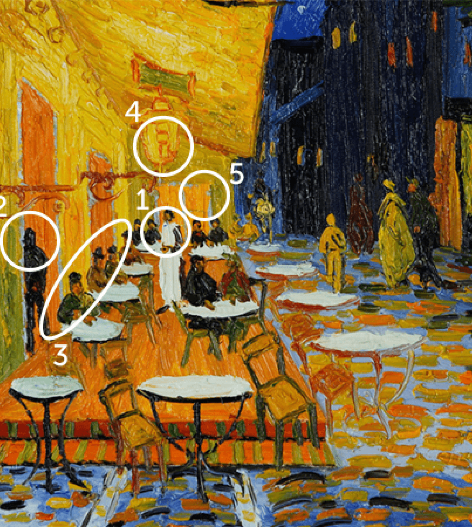 Сцена, изображенная на ней, довольно проста — это ночь и куча людей с напитками в полупустом кафе